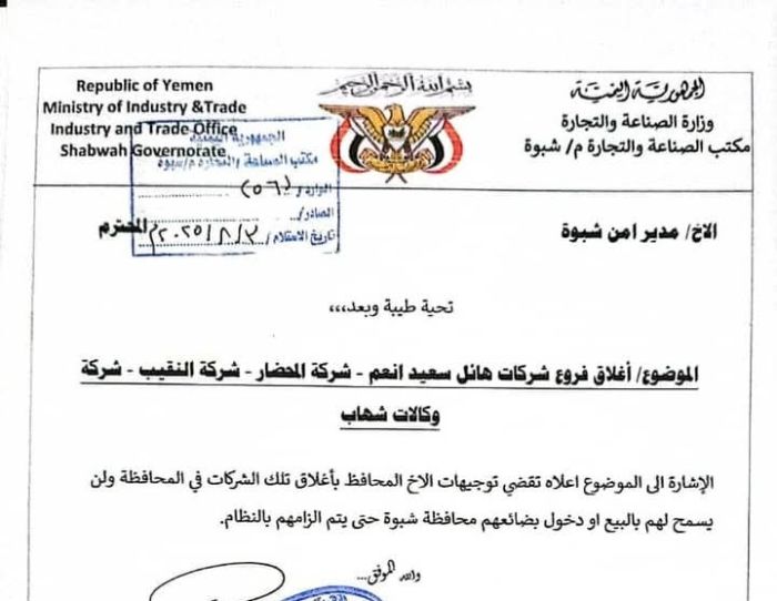 شبوة | إغلاق ثلاث شركات تجارية كبرى لمخالفتها التسعيرة الرسمية