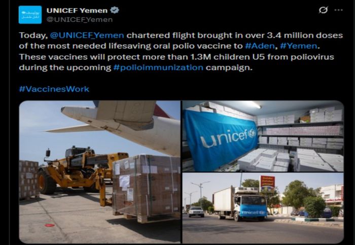 UNICEF: Over 3.4 million doses of polio vaccine to Aden, Yemen