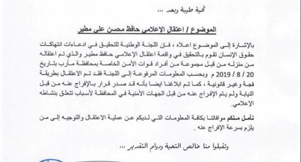وقالت اللجنة في مذكرة رسمية بعثت بها إلى محافظة مأرب، اللواء سلطان العرادة، إنها "تقوم بالتحقيق في واقعة اعتقال الإعلامي حافظ مطير، والذي تم اعتقاله بطريقة فجة وغير قانونية، من منزله من قبل مجموعة من أفراد قوات الأمن الخاصة.
