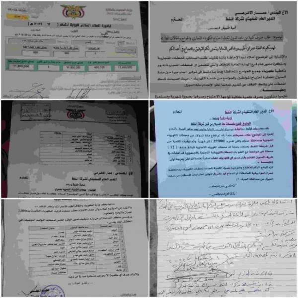اتهمت نقابات محطات الكهرباء التجارية في أمانة العاصمة ومحافظتي صنعاء وعمران شركة النفط التي تسيطر عليها ميليشيا الحوثي فرع محافظة صنعاء باحتكار حصصها من مادتي البترول والديزل والتلاعب بها وبيعها بطرق غير قانونية في السوق السوداء وبمبالغ باهظة حيث يصل سعر اللتر الواحد من مادة الديزل إلى 1100 ريال .
