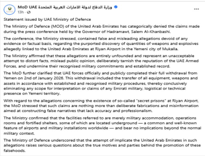 The UAE's ministry of defence on Tuesday "categorically denied" the allegations made by the governor of Hadhramaut, Salem Al Khanbashi , claiming to have allegedly discovered weapons and "secret prisons" linked to the UAE at an airbase in the country.