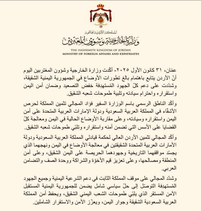 الأردن يشدد على ضمان أمن اليمن واستقراره واحترام سيادته