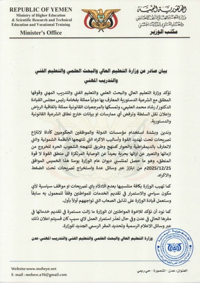 وزارة التعليم العالي تدين الابتزاز وأخذ التصريحات تحت الإكراه من الموظفين، وتشدد على استمرار عمل الوزارة