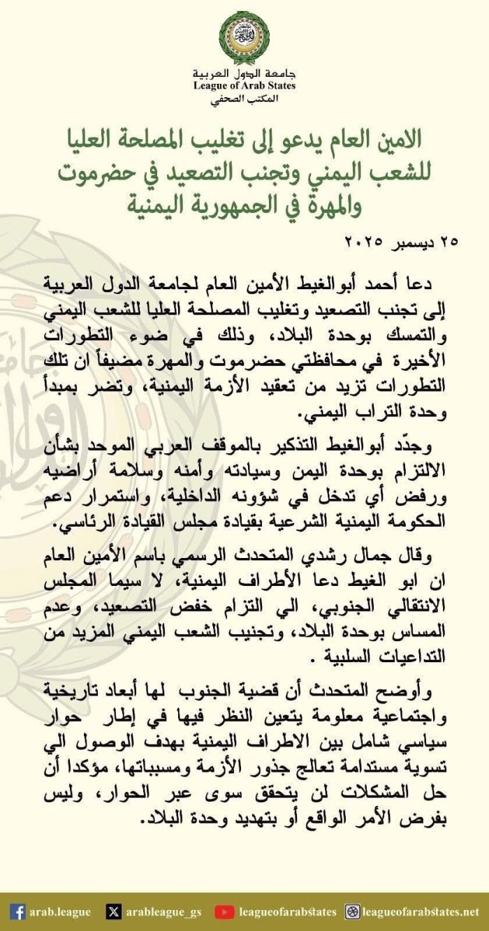 أمين عام جامعة الدول العربية يؤكد على الموقف العربي بشأن وحدة اليمن وسيادته وأمنه وسلامة أراضيه
