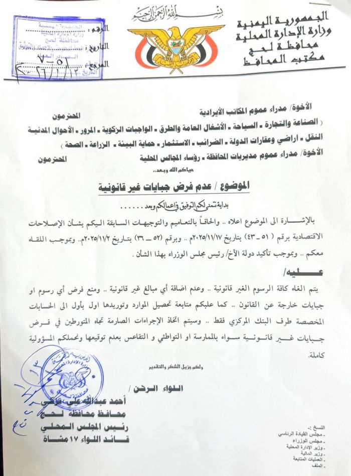 محافظ لحج يوجه بإلغاء كافة الجبايات غير القانونية ويتوعد المخالفين بإجراءات صارمة