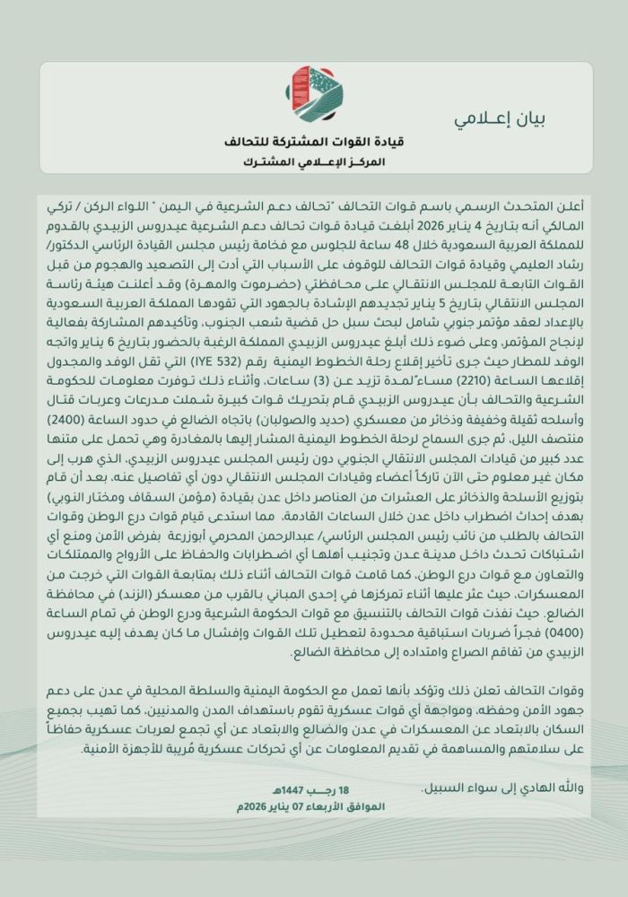 "قوات التحالف" تعلن إفشال مخطط للتصعيد العسكري في عدن والضالع وتكشف عن اختفاء "الزبيدي"