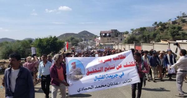 مسيرة جماهيرية بريف تعز تطالب بكشف نتائج التحقيقات بجريمة اغتيال الحمادي
