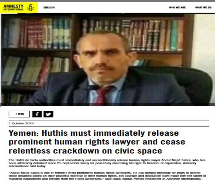 Amnesty International: Houthis must immediately release prominent human rights lawyer