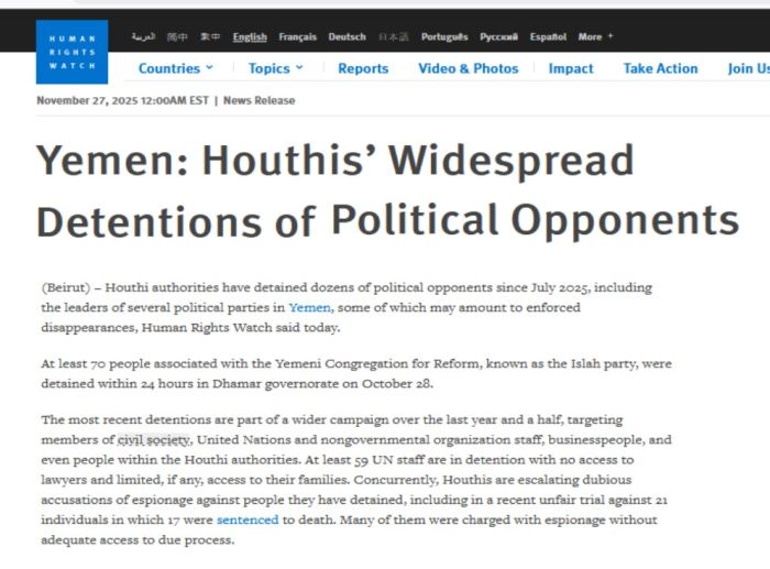 HRW: Houthis’ Widespread Detentions of Political Opponents