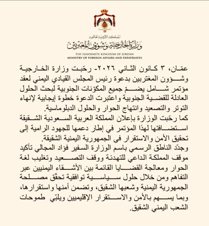 الأردن يرحب بدعوة رئيس مجلس القيادة لعقد مؤتمر شامل للمكونات الجنوبية واستضافة السعودية له