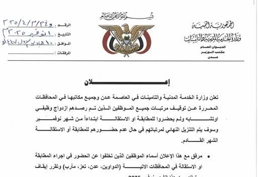 عدن.. الخدمة تنشر أسماء مزدوجي الوظيفة وتحذر من إيقاف المرتبات