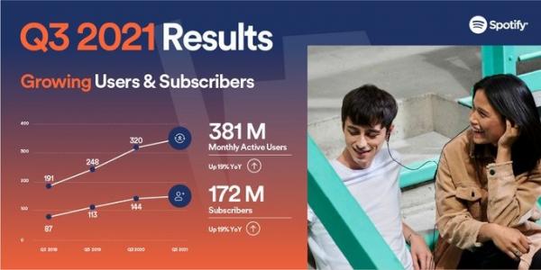أعلنت منصة سبوتيفاي عن امتلاكها 381 مليون مستخدم نشط شهريًا منهم 172 مليون مستخدم من ذوي الاشتراكات المدفوعة، وذلك في تقريرها المالي للربع الثالث من العام 2021، بنمو قدره 19% عن نفس الفترة من العام الماضي.