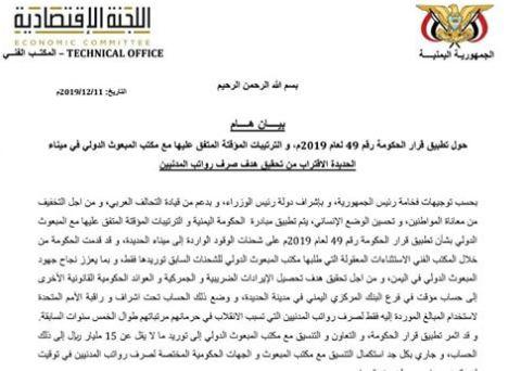 وقال المكتب الفني للجنة الاقتصادية في بيان له، إن “تطبيق قرار الحكومة رقم 49 والترتيبات المؤقته المتفق عليها مع المبعوث الدولي في ميناء الحديدة، حققت نجاحاً في حجز ما يزيد عن 15 مليار ريال في الحساب المؤقت”.
