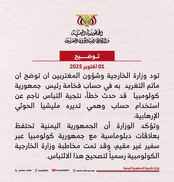 أصدرت وزارة الخارجية وشؤون المغتربين اليمنية اليوم توضيحاً رسمياً بشأن تغريدة نُشرت في حسابها وتعلقت بفخامة رئيس جمهورية كولومبيا.