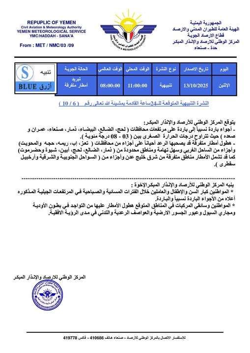 أصدر المركز الوطني للأرصاد الجوية والإنذار المبكر في اليمن اليوم (الاثنين 13 أكتوبر 2025) نشرة تنبؤات جوية حذَّر فيها من حالة جوية مضطربة متوقعة خلال الـ 24 ساعة القادمة، خاصة في المرتفعات والمناطق الساحلية.