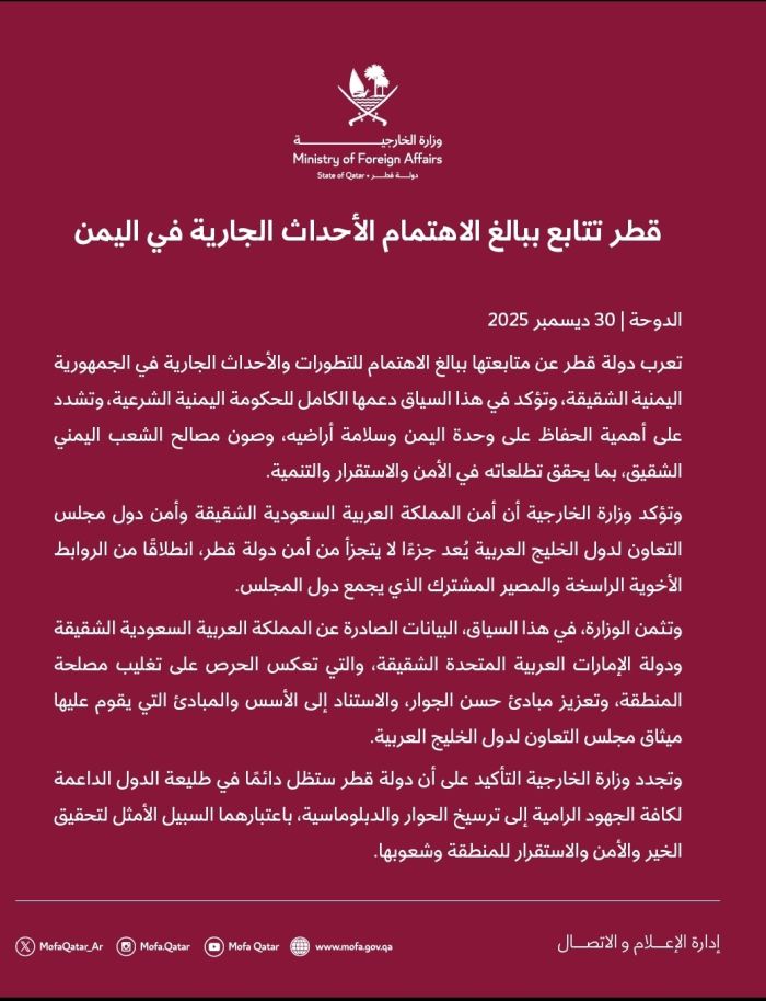 أعلنت دولة قطر عن متابعتها ببالغ الاهتمام للتطورات والأحداث الجارية في الجمهورية اليمنية الشقيقة، مجددة موقفها الثابت والداعم للمؤسسات الشرعية والحرص على وحدة واستقرار المنطقة.
