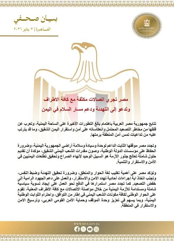واختتمت الخارجية المصرية بيانها بالتأكيد على أن تعزيز وحدة الموقف اليمني واحترام الثوابت الوطنية هو الضمانة الأساسية لحماية الأمن القومي العربي وترسيخ الاستقرار في منطقة الشرق الأوسط.