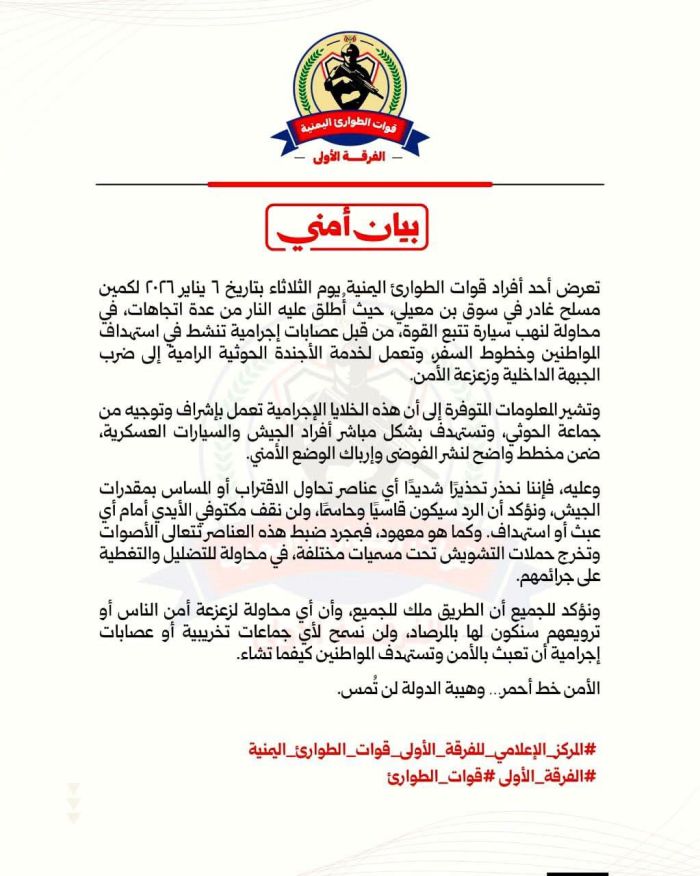 أصدرت قيادة قوات الطوارئ اليمنية (الفرقة الأولى)، بيانًا أمنيًا عاجلاً، كشفت فيه عن تعرض أحد أفرادها لكمين غادر نفذته عصابة مسلحة يوم الثلاثاء الماضي، الموافق 6 يناير 2026، في منطقة "سوق بن معيلي".