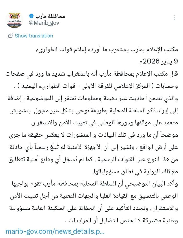 أعرب مكتب الإعلام بمحافظة مارب، في بيان رسمي صدر اليوم الجمعة، عن استغرابه الشديد لما تم تداوله عبر منصات التواصل الاجتماعي التابعة للمركز الإعلامي لـ "الفرقة الأولى - قوات الطوارئ اليمنية"، مؤكداً أن تلك المعلومات تفتقر إلى الدقة والموضوعية.