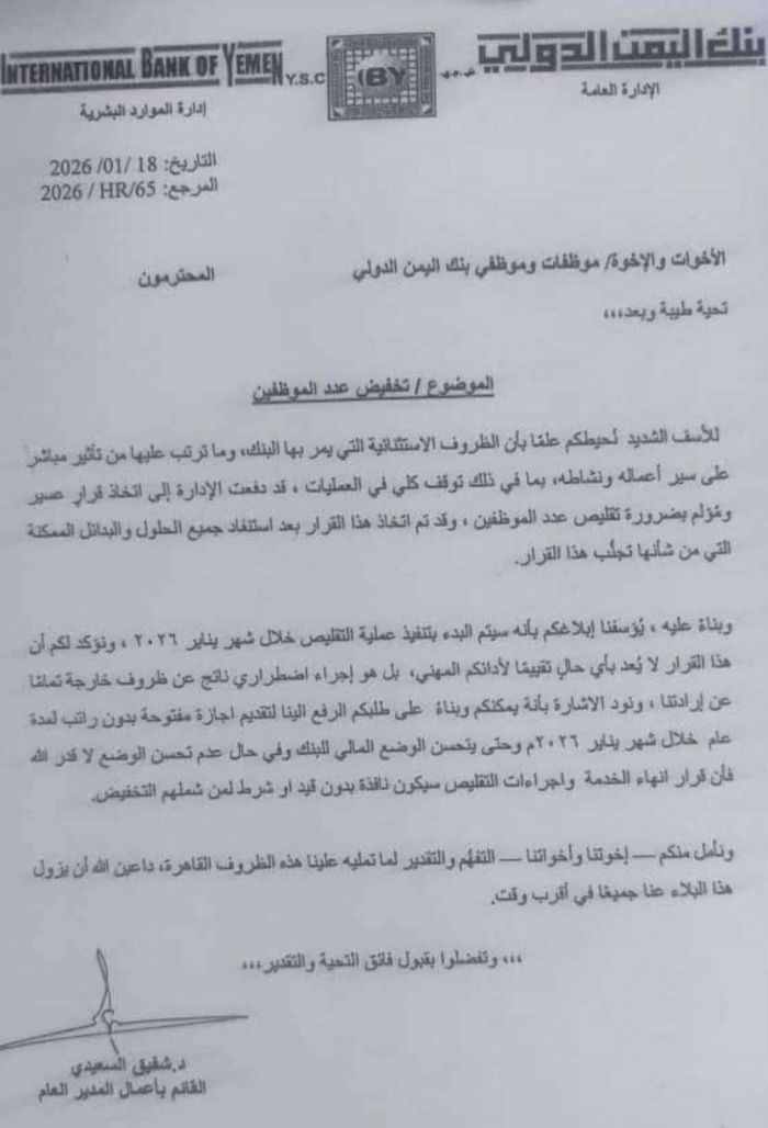وأفادت المذكرة التي حصل موقع قناة اليمن اليوم على نسخة منها أن هذا الإجراء يأتي ضمن سياسة تقشفية للبنك تشمل الاستغناء عن عدد من الكادر الوظيفي نتيجة تراجع الأداء المالي والضغوط الخارجية.