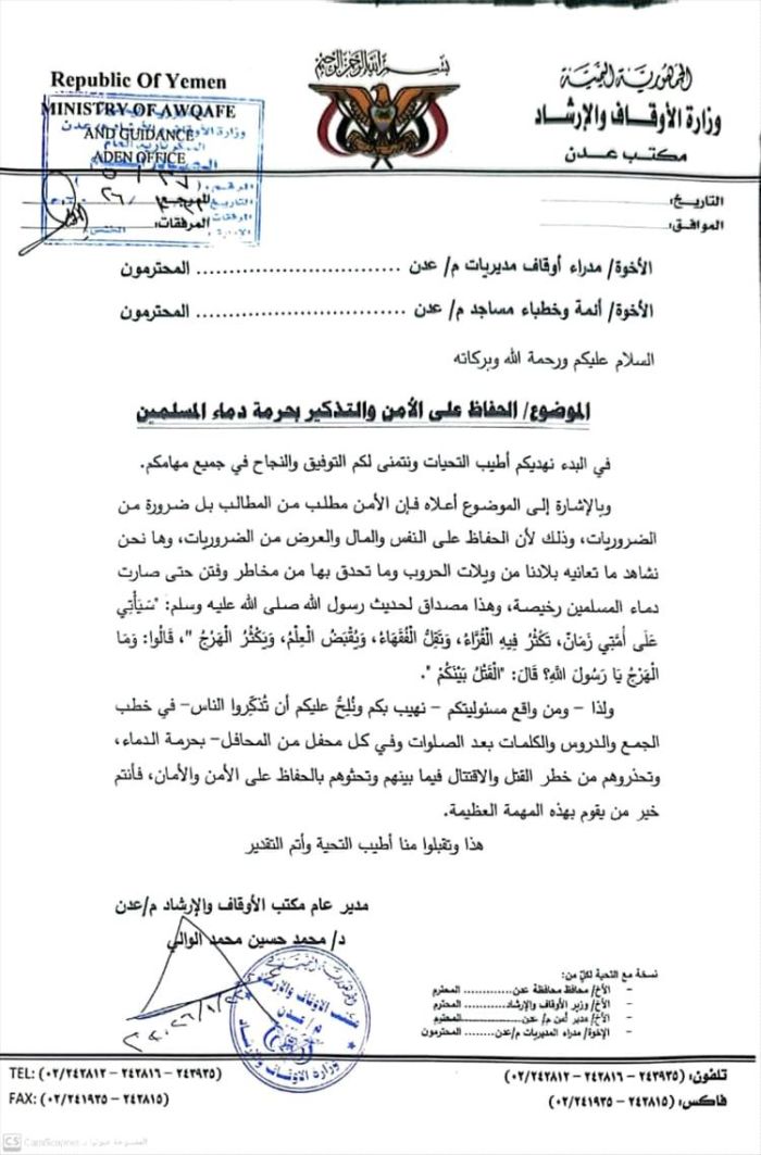 أصدر مكتب الأوقاف والإرشاد بالعاصمة المؤقتة عدن، تعميماً هاماً إلى مدراء أوقاف المديريات وأئمة وخطباء المساجد، يدعوهم فيه إلى تكثيف الجهود الدعوية للحفاظ على الأمن والاستقرار.