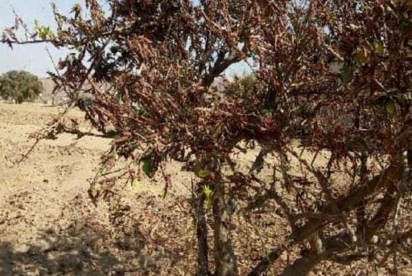 وقامت أسراب الجراد بمهاجمة أشجار السدر والسيسبان، الأمر الذي يتسبب في إتلاف الشجرة خلال لحظات.